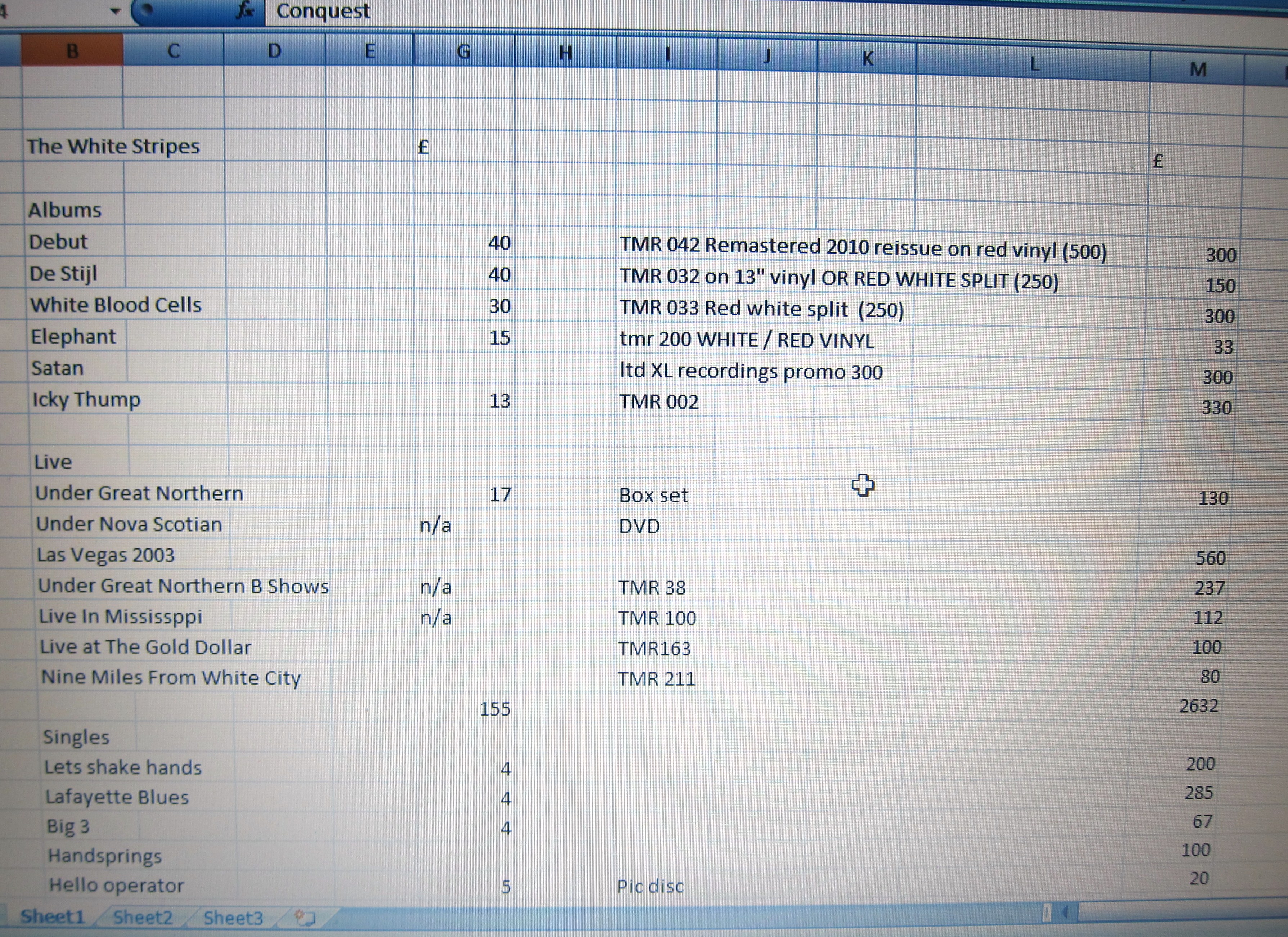 White Stripes excel spreadsheet